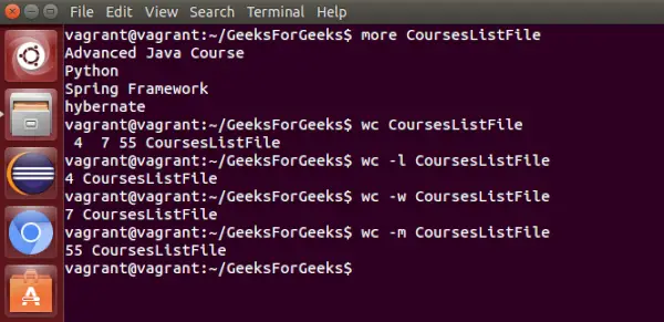 - toalett : Används för att räkna antalet tecken, ord i en fil.