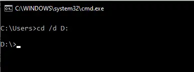 För att ändra arbetskatalogen till en annan enhet, kör kommandot cd /D följt av en sökväg till en katalog. Vägen bör uppfylla följande kriterier –