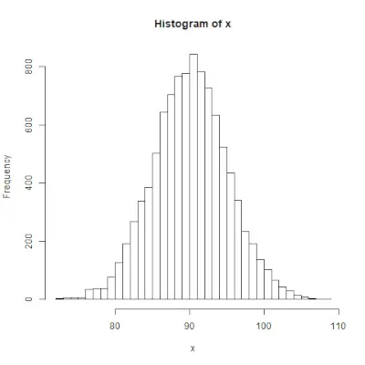 # Create a vector of 1000 random numbers> # with mean=90 and sd=5> x <>-> rnorm(>10000>, mean>=>90>, sd>=>5>)> > # output to be present as PNG file> png(>file> => 'rnormExample.webp'>)> > # Create the histogram with 50 bars> hist(x, breaks>=>50>)> > # Save the file.> dev.off()> |