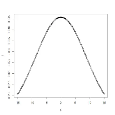 # creating a sequence of values> # between -15 to 15 with a difference of 0.1> x>=> seq(>->15>,>15>, by>=>0.1>)> > y>=> dnorm(x, mean(x), sd(x))> > # output to be present as PNG file> png(>file>=>'dnormExample.webp'>)> > # Plot the graph.> plot(x, y)> > # saving the file> dev.off()> |