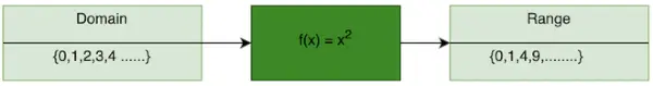 Till exempel: I figuren nedan är f(x) = x2. Uppsättningen av alla ingångar kallas Domain och uppsättningen av alla utgångar betraktas som intervallet.