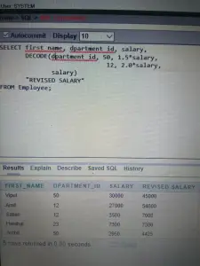 Input : SELECT first_name, department_id, salary, DECODE(department_id, 50, 1.5*salary, 12, 2.0*salary, salary) 'REVISED SALARY' FROM Employee;>