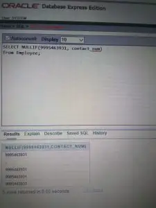 Input: SELECT NULLIF(9995463931, contact_num) from Employee;>