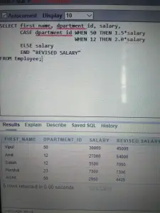 Input : SELECT first_name, department_id, salary, CASE department_id WHEN 50 THEN 1.5*salary WHEN 12 THEN 2.0*salary ELSE salary END 'REVISED SALARY' FROM Employee;>